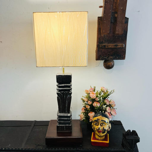 Khoj CraftsSouth Indian short pedestal converted to lamp Carved teak wood Attractive and Interesting Bulb not Included Shade Included 2m long wire Size :...