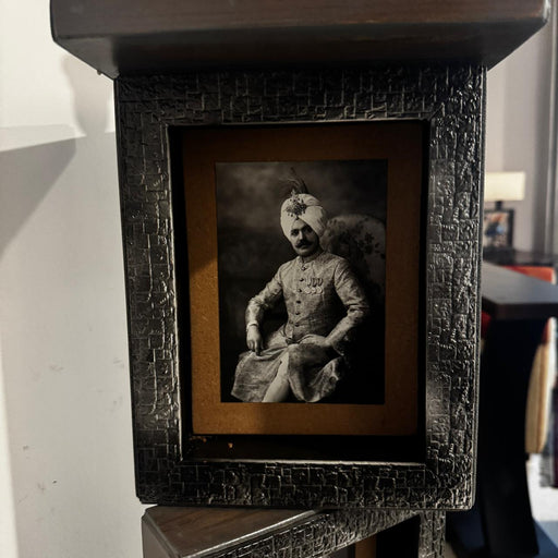A striking lamp featuring vintage prints of Maharajas, arranged within irregularly aligned box forms that give the piece a sculptural, gallery-like...